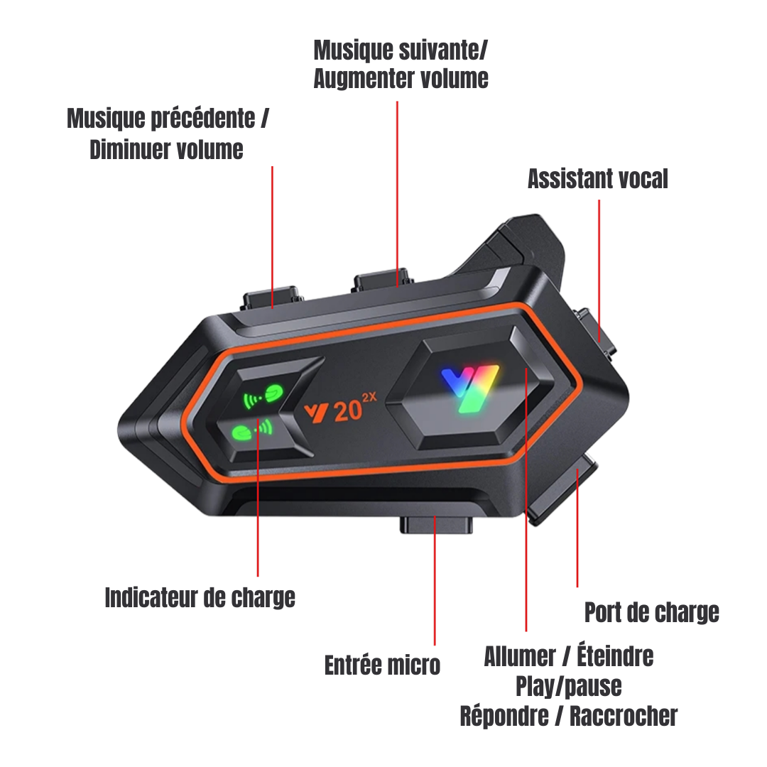 RideCom utilise une technologie de réduction intelligente du bruit qui filtre activement les bruits de fond indésirables, garantissant que vos communications soient claires et sans interruption, même dans des environnements bruyants.